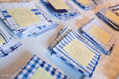 Today I could start sewing together the tabelcloth. 252 squares (plus a few additional ones) are thoroughly cut and placed. Each vertical row is gathered with the first patch on top, and the rows have gotten a number from left to right.